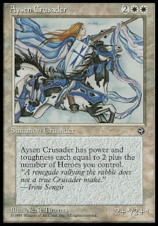 • The term "Aysen Crusader" apparently refers to lay zealots, a group of rabble that is only turned into a true fighting force when a hero takes charge... which is very odd flavor for a card that clearly represents the hero taking charge, not the rabble being led.